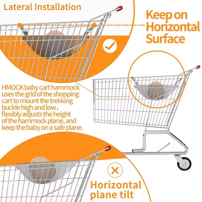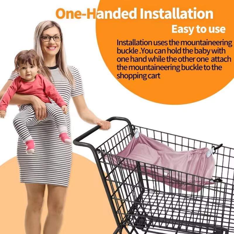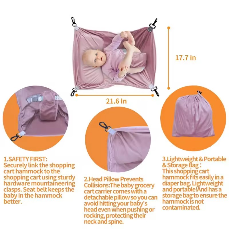 Stroller Hammock for BabyThis is a multi - scenario compatible baby hammock, which has the following features: Compatibility: It can be firmly installed on the metal frame of a supermarket shopping cart through hooks and other accessories, creating an exclusive "lying space" for the baby. It does not occupy the original storage area of the shopping cart, making it convenient for parents to place shopping items at the same time. Comfort: Made of soft fabric and equipped with a built-in soft pad, it can provide a comfortable lying experience for the baby and effectively relieve the baby's discomfort during the shopping process. Safety: It has a stable structure and can bear the baby's weight. It prevents the baby from directly contacting the cold metal structure of the shopping cart and also avoids potential safety hazards caused by the limited space in the shopping cart for the baby. Practicality: It allows parents not to carry an extra stroller when shopping, simplifying travel equipment and improving the convenience of shopping with a baby. It is especially suitable for babies who are relatively young and cannot sit for a long time. Material:Velvet Feature:Water Resistant, Portable Application:Protect closure type:Buckle Style:Simple model number:A23070134 place of origin:Guangdong, China brand name:Youngshoots Product name:Baby Hammock Carrier Color:customized Logo:Custom Logo Accepted Material:polyester Size:21.6*17.7 inch OEM/ODM:Customize ODM OEM MOQ:500 Pieces Packing:1pc/poly Bag DELIVERY TIME:25-30 Days Package:carton