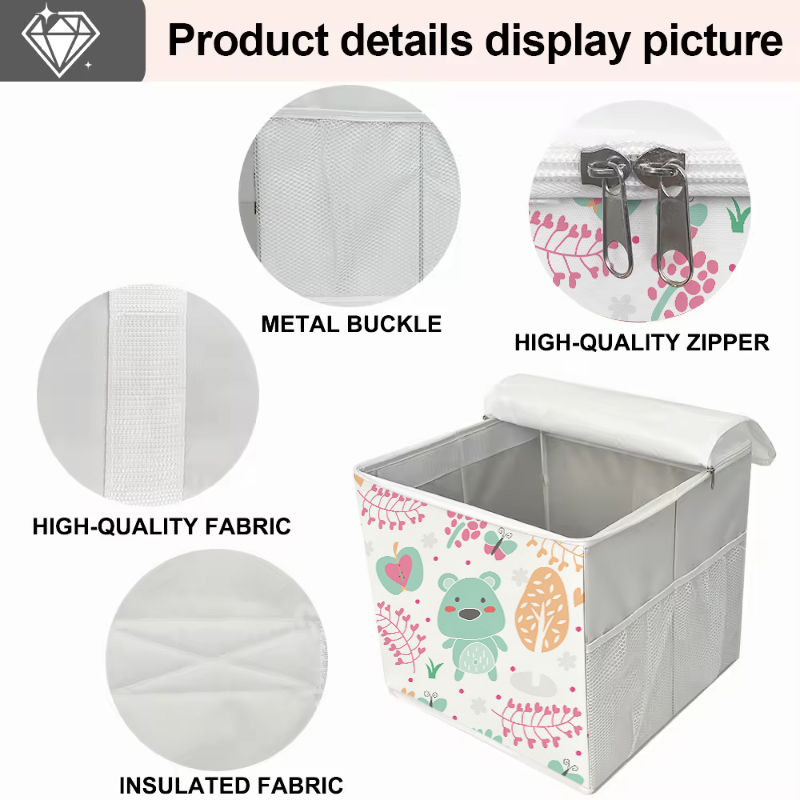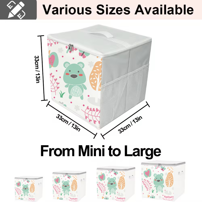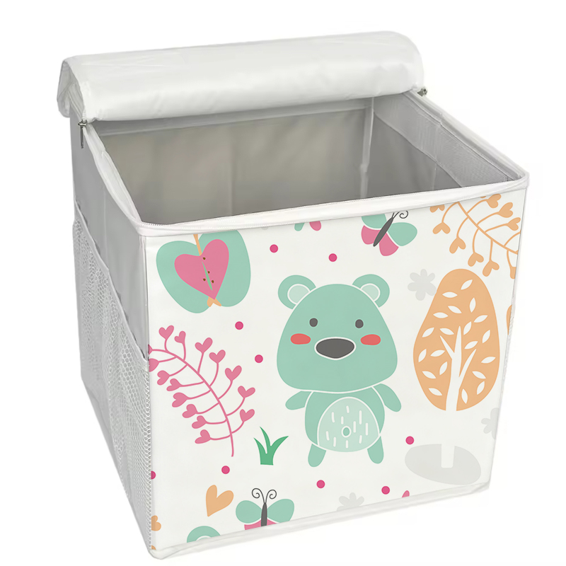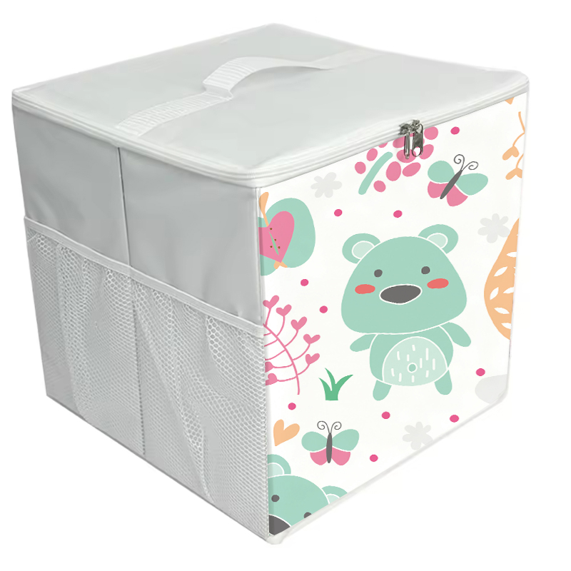Zipper-equipped Storage BoxThis is a cartoon storage box with a zipper. Its main design is full of childlike fun, with cute patterns such as green bears, butterflies, and flowers printed on the side. It is equipped with a white zippered top cover and a white handle on the top for easy carrying. There is also a mesh storage pocket on the side. The overall shape is square, which is both practical and decorative. It is suitable for storing children's items or adding a childlike style to the home. Product:Home Organizer Material:Fabric Specification:30*30*30 CM Shape:Rectangle Capacity:10-20 L(10.57-21.13Qt) Feature:Folding, Stocked Style:Modern Use:Wardrobe Storage Organizer functional design:Multifunction Technics:Sewing Load:5-10 kg dimensional tolerance:<±1mm weight tolerance:<±1%(Include) place of origin:Jiangsu, China brand name:Youngshoots Product name:Home Storage Organizer Color:Custom Color Logo:Storage Organizer Usage:Home Organizers Feature:Eco-Friendly