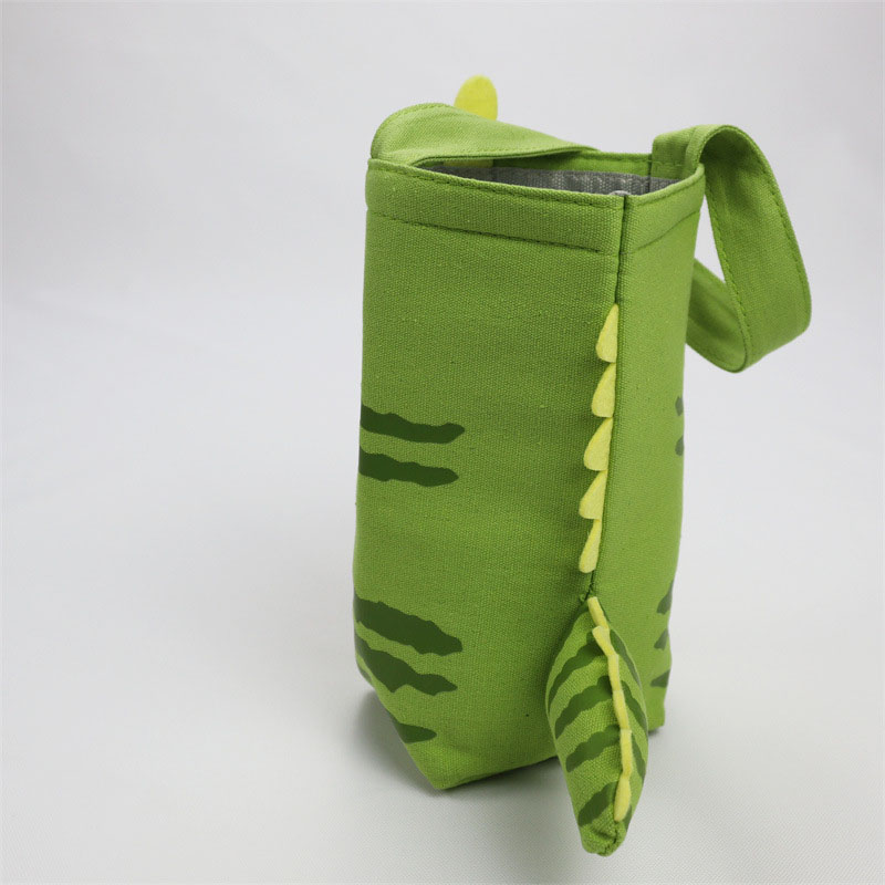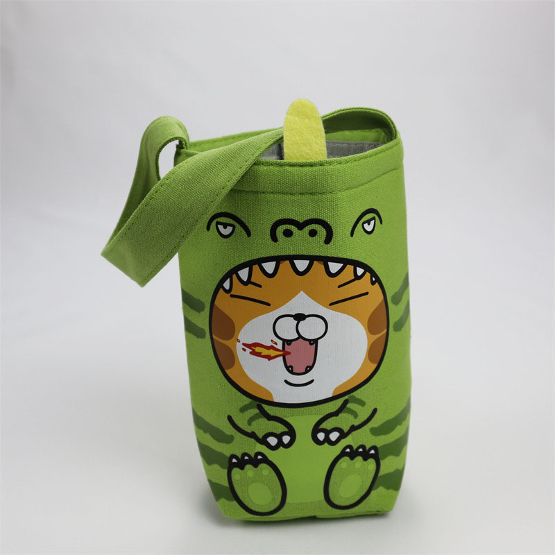 Cartoon Water Bottle BagsThis is a cute and childlike water bottle bag. Appearance Style: It mainly features green as the base color, printed with cartoon patterns that combine cat and dinosaur elements. The cat is transformed into a small fire-breathing dinosaur, with a playful and vivid image full of fun.Material & Structure: It appears to be made of canvas, offering good durability. Designed in a barrel shape with an opening at the top, it is equipped with a green hand strap for easy carrying. It also has yellow decorative parts that enhance the three-dimensional look of the design. Function & Purpose: Primarily used for storing water bottles, it can protect the bottle while its lovely appearance is highly decorative. Suitable for children or people who love cute styles, it adds a touch of fun to carrying water bottles during daily outings. Material:Canvas Application:Advertising Size:customized size Pattern Type:Cartoon Handle:pp webbing Closure Type:Shoulder Style:Handled model number:recyclable Canvas bag place of origin:Guangdong, China brand name:youngshoots Product name:Gift Canvas bags Color:Customized Color Feature:Reusable Usage:Travel Logo:Accept Customized Logo MOQ:500pcs Sample time:5-7 Days Delivery time:7-20days Function:Recyclable Cotton Bags Quality:Highly Control